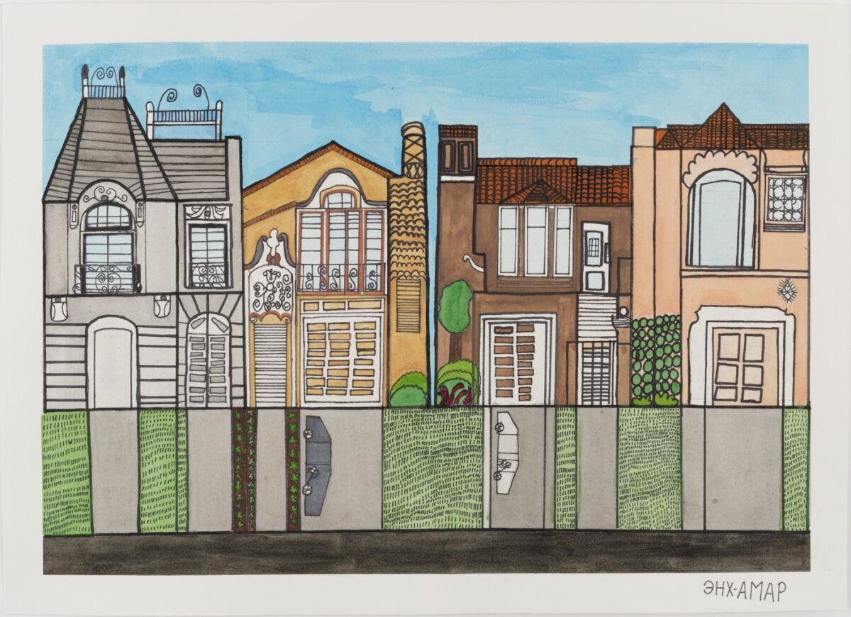 Enkh-Amar Shagdarguntev, Parkside Houses, 2025, marker and watercolor on paper, 15.5 x 21.5 in