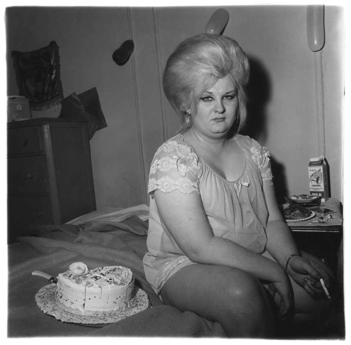 Diane Arbus, Transvestite with her birthday cake, N.Y.C. 1969, gelatin silver print, 20 x 16 inches (sheet) [50.8 x 40.6 cm] © The Estate of Diane Arbus.